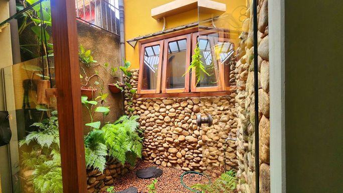 Portas de correr em folhas de vidro + 03 degraus em pedra, dão acesso a esta área. Ambiente com pequenas árvores, orquídeas, e piso em pedra, é estratégico para tomar vinhos com amigos ou assar marshmallow. 01 banheiro de festas.