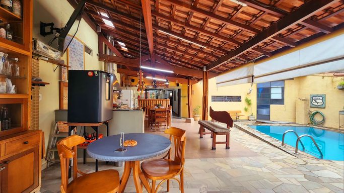 Área coberta com fino acabamento em piso, pastilhas, pia, churrasqueiras, pedras, bar, mesas em madeira de lei, estantes, toldos, sistema de “barril-chopeira”, iluminação, decoração e obras de arte assinadas pelo Tóride Celegatti, fazem vida a todo este ambiente, ainda interno, da primeira área gourmet.