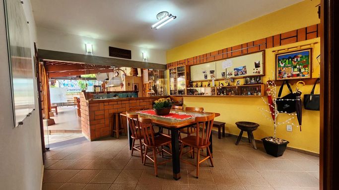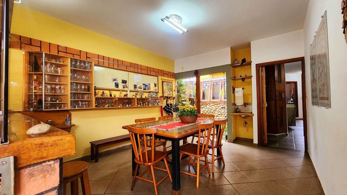 Este ambiente tem acesso direto à cozinha e à área gourmet, pela própria passagem em porta, e por portas-balcão que faz-se comunicar com o bar da área gourmet. 01 banheiro social.